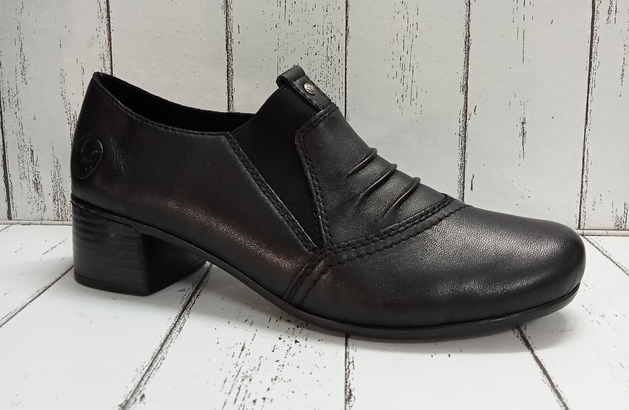 Ladies smart/casual leather shoe/boot with 45mm heel and joined elasticated gussets to upper for a comfortable fit.