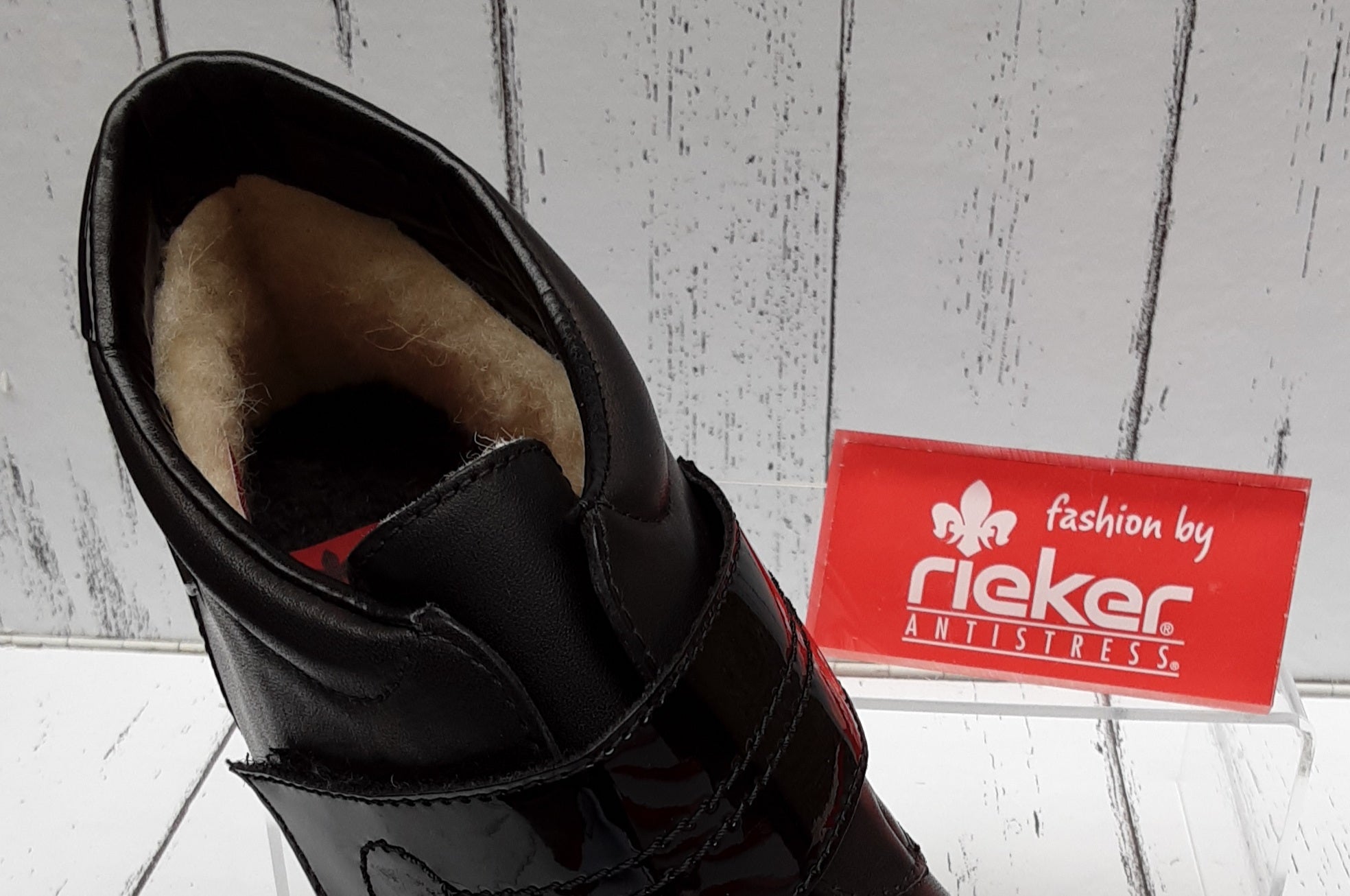 Smart/casual Black leather ankle boot with RiekerTEX technology making the boot showerproof.  Has a hook and loop fastening strap and a wool lining for added warmth.