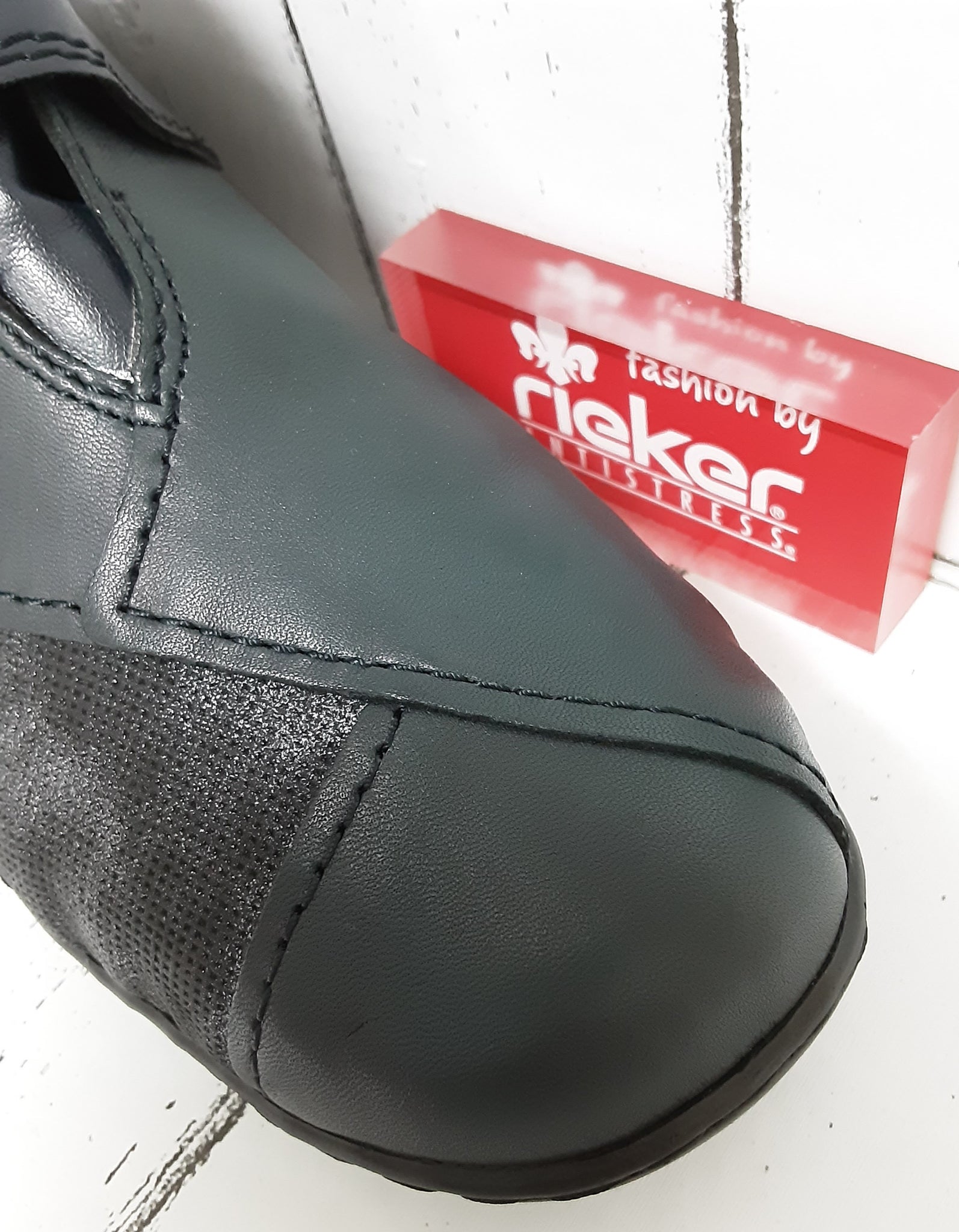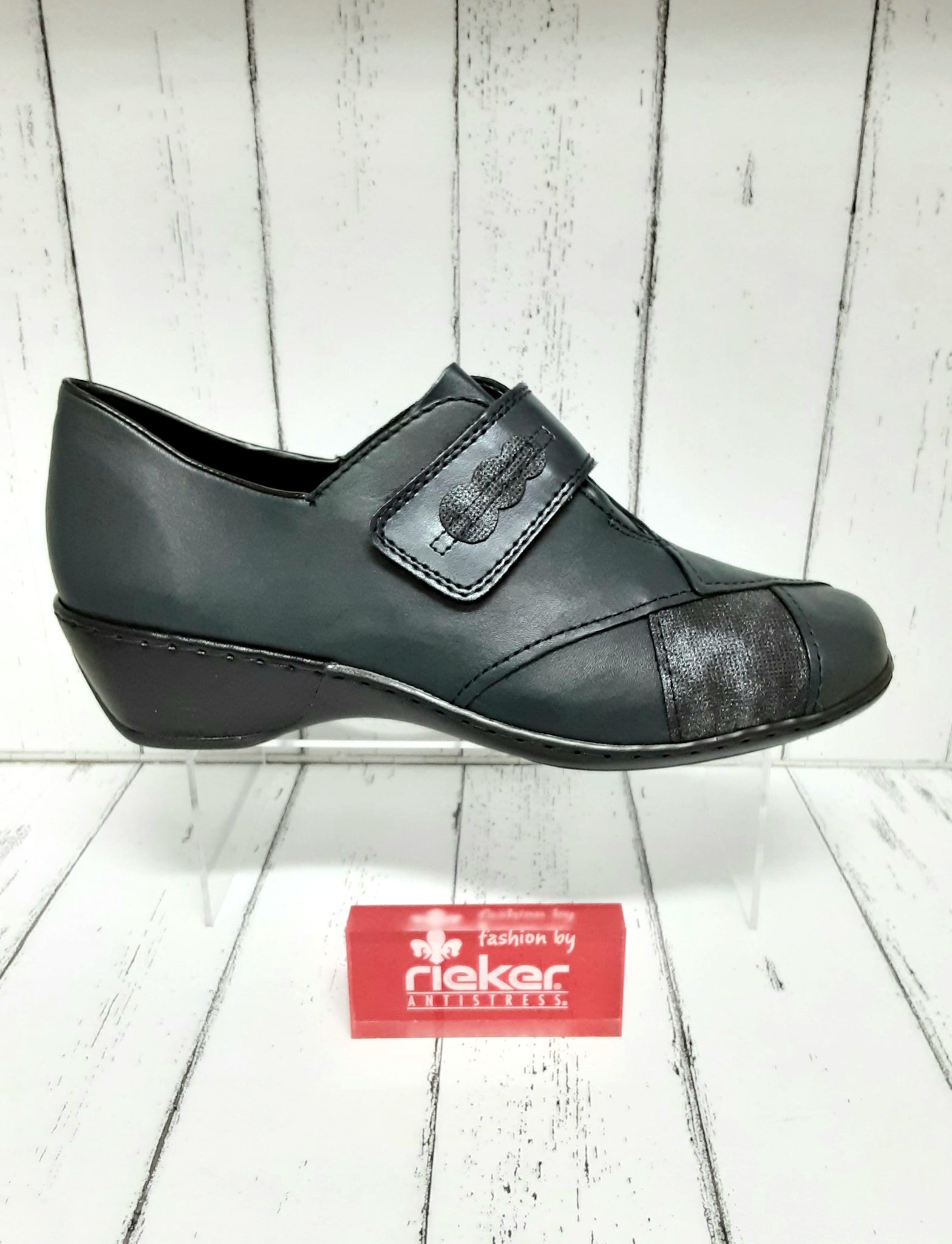 Ladies Dark Blue 42mm heeled ladies shoes with hook and loop fastening strap.