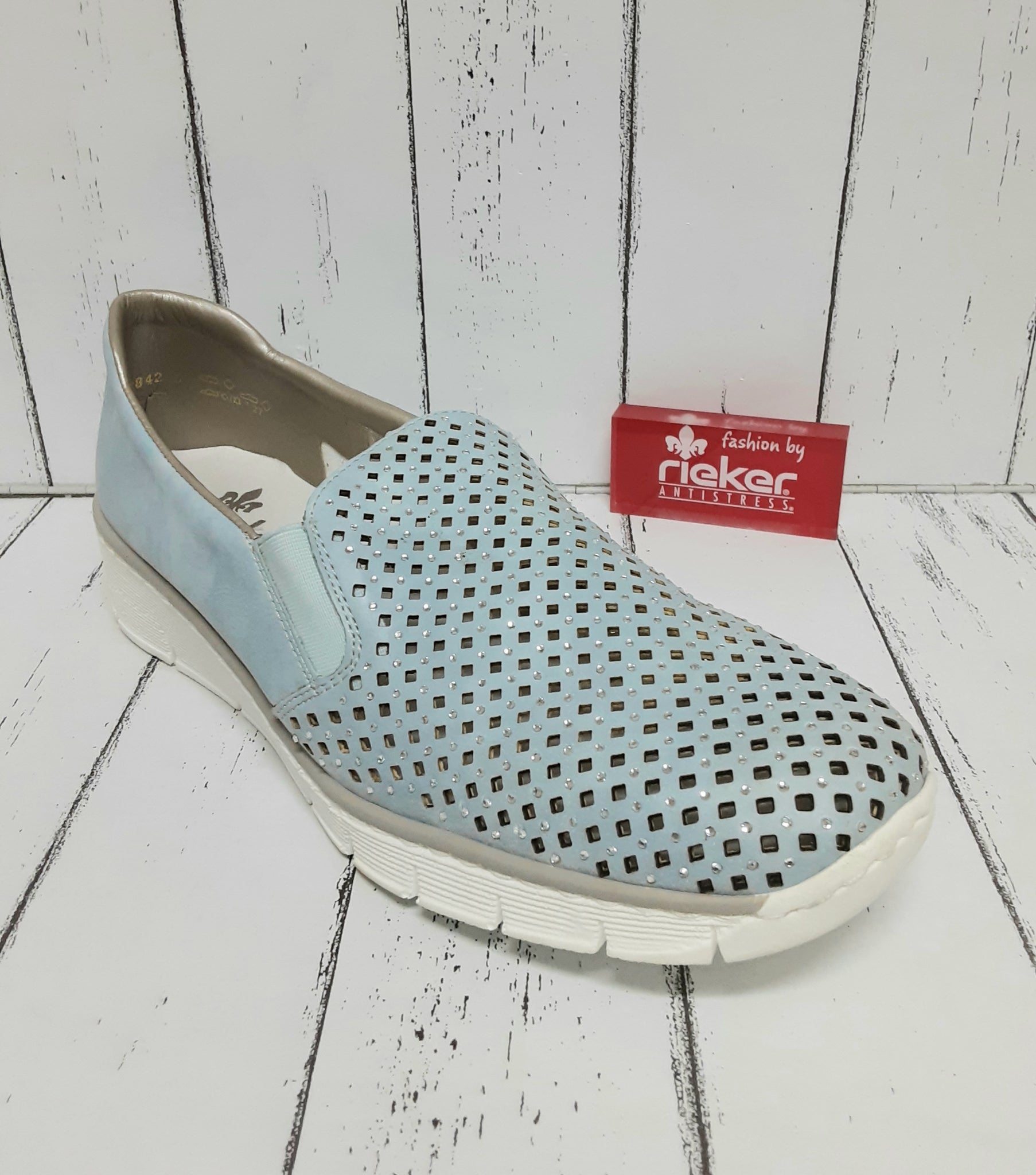 Ladies pale Blue slip on shoe with cut out pattern across the toe which is adorned with silver diamante studs. Two elasticated panels stretch to allow easy access. Extra cushioned insole all on a white wedge sole unit of 25.4mm.