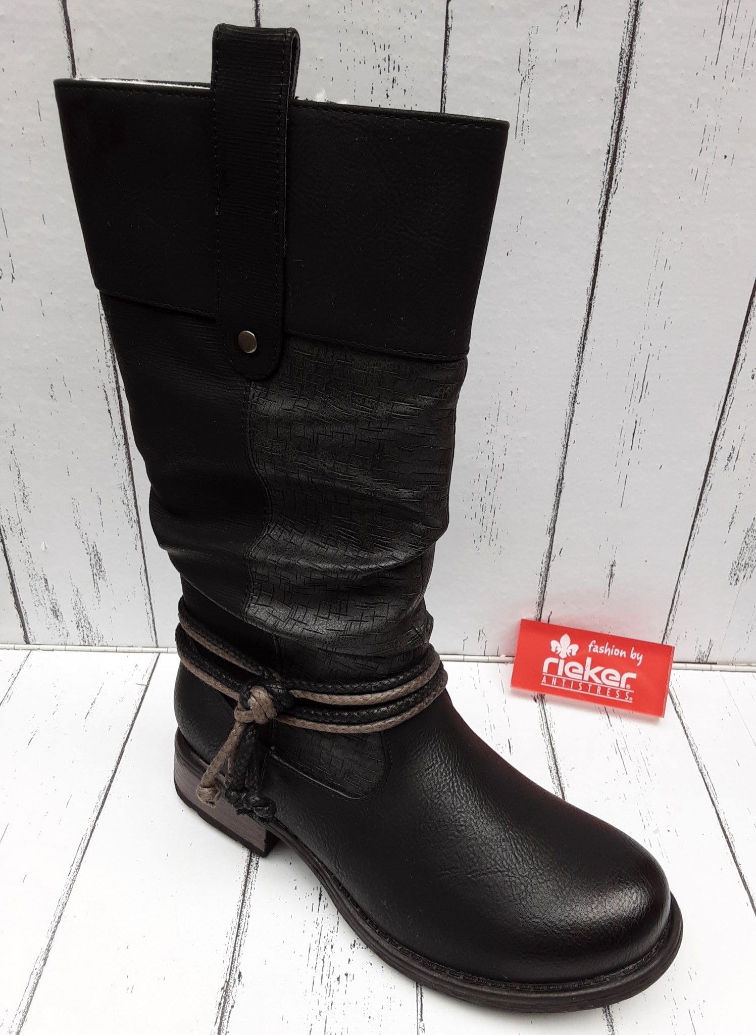 Ladies Black combination low heeled calf length boot. Fleece lined for warmth, with side zip and tassle detail.