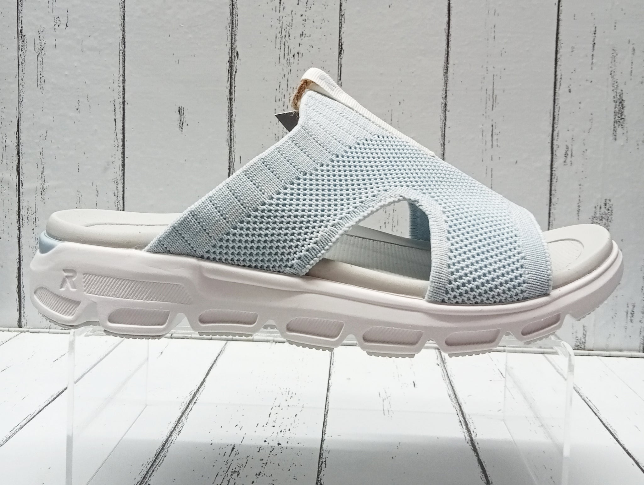 Super comfy Ladies casual mule from Rieker's new 'Evolution' range.  Has a a textile upper in Light Blue on a white sole base.