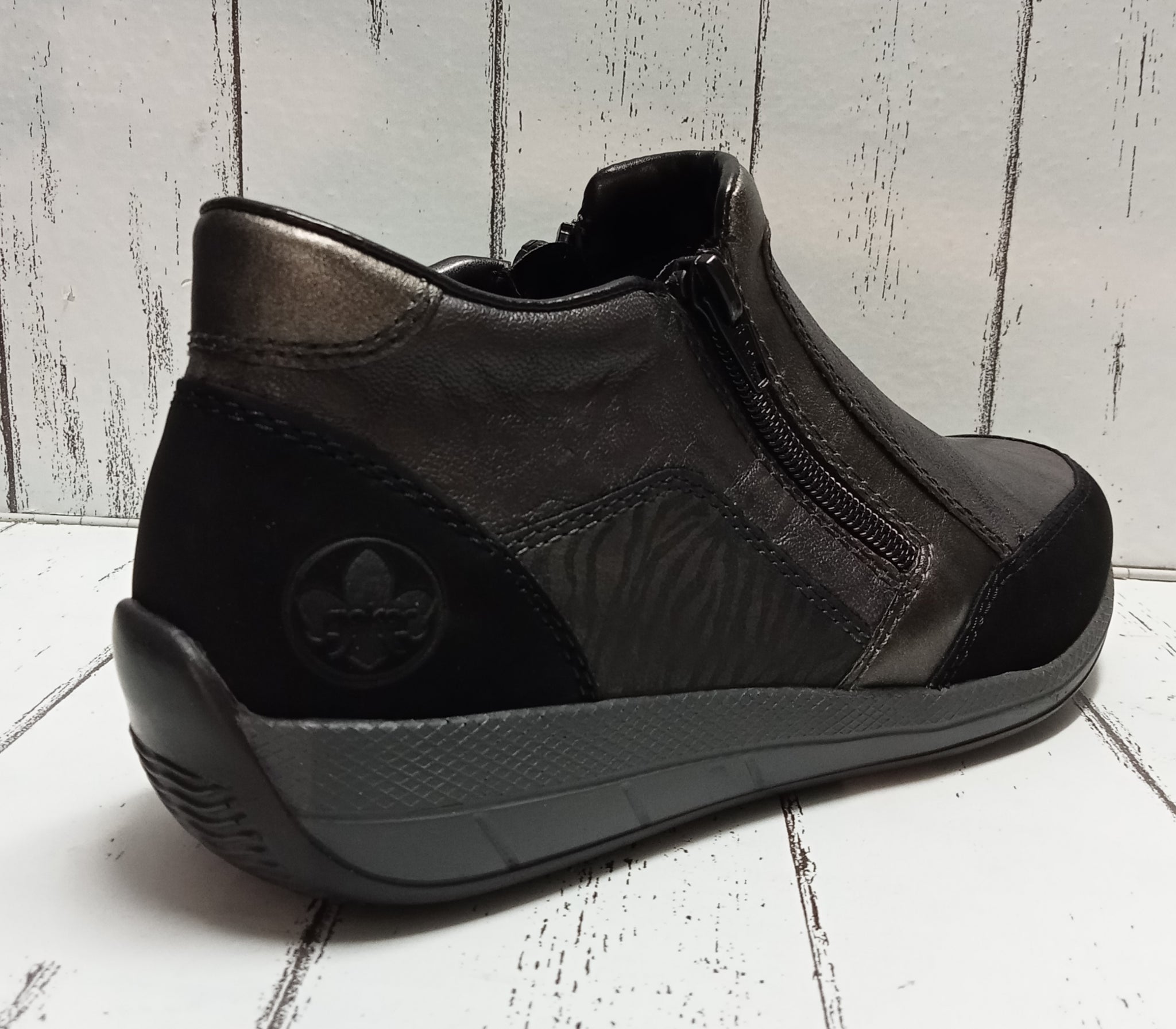 Ladies smart/casual wider fitting 2 zip ankle boot in a Grey/Black/Metallic combination, with removeable insole and warm lining.
