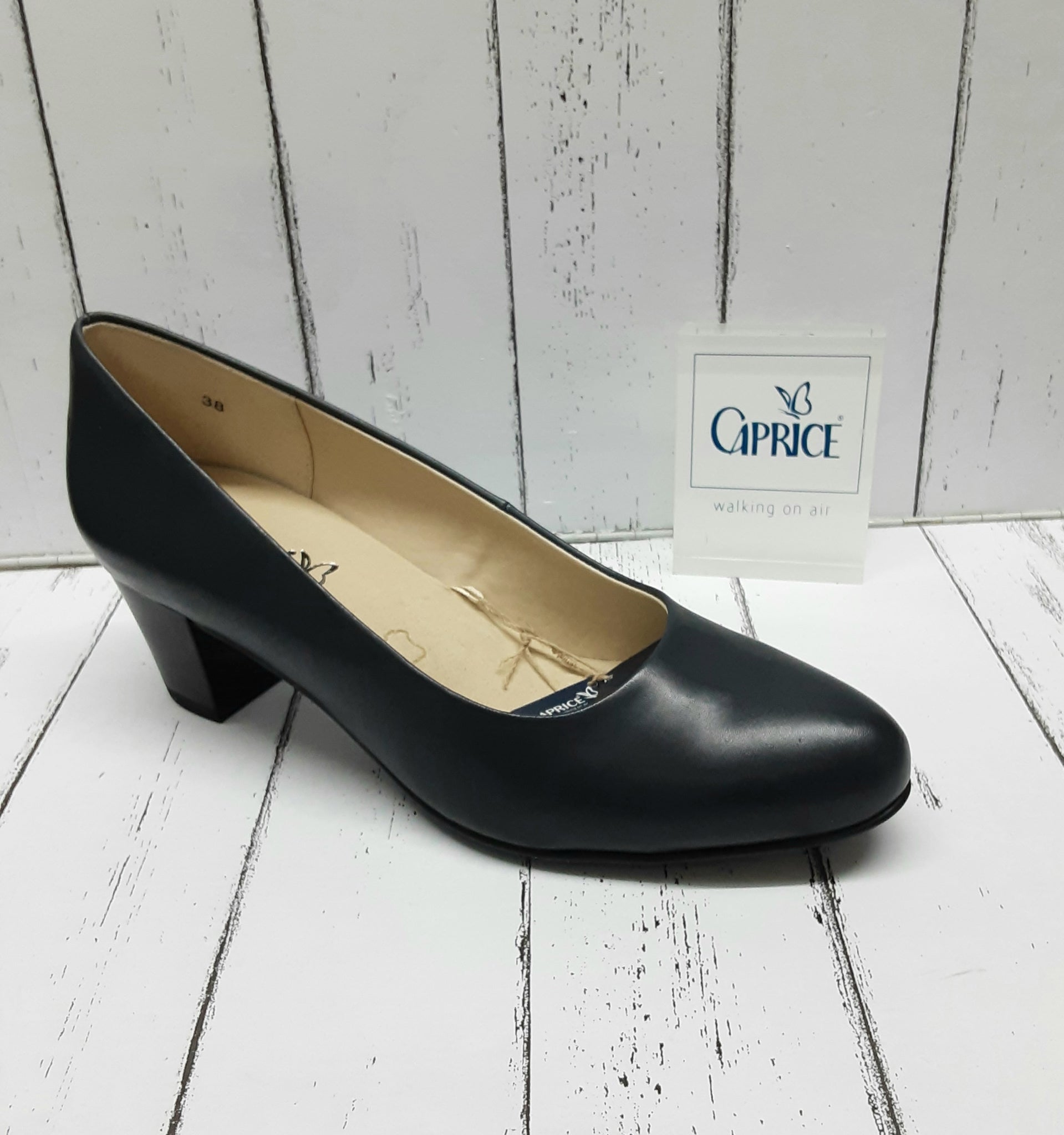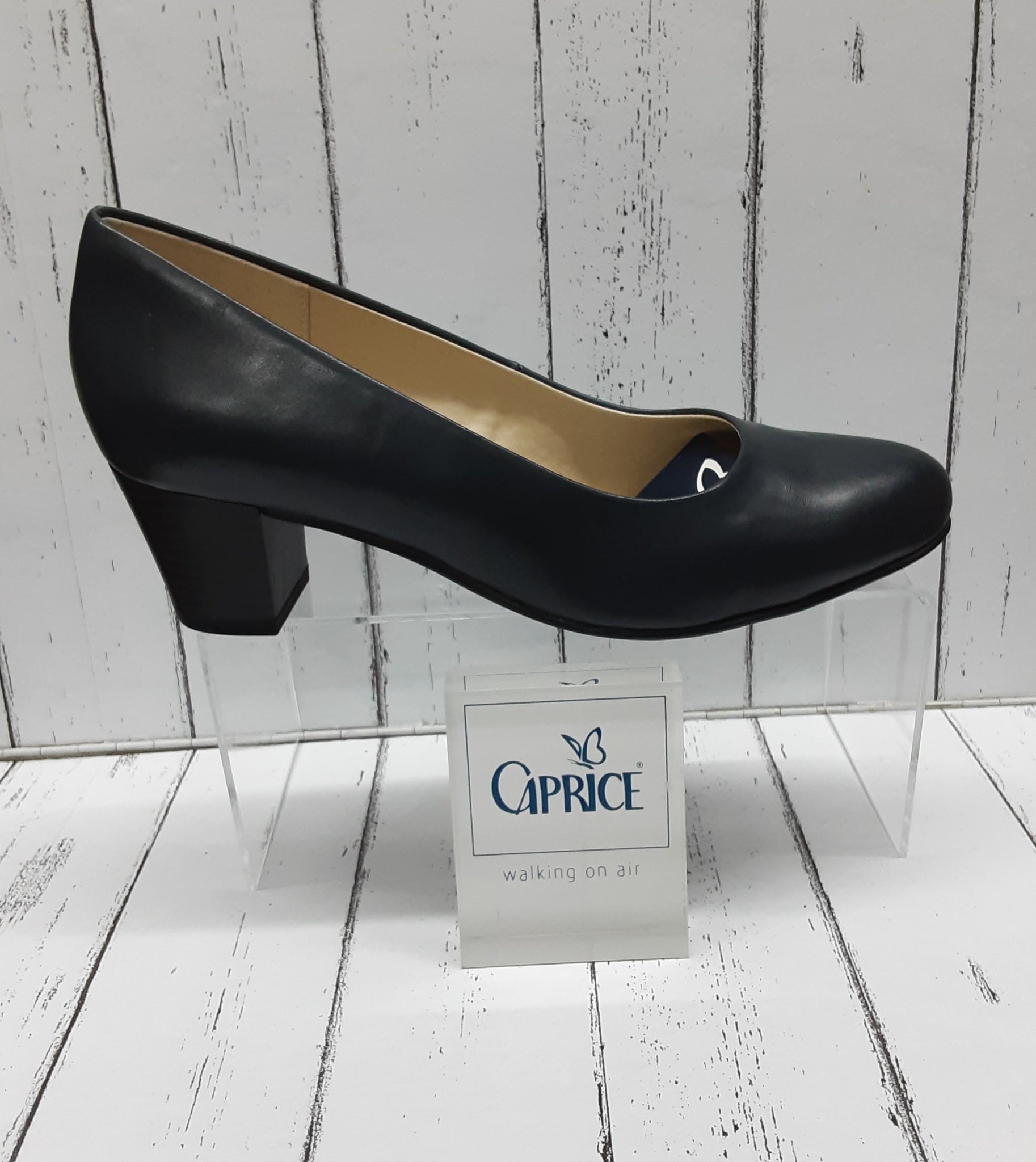 Ladies smart Navy leather court shoe with a 45mm heel.