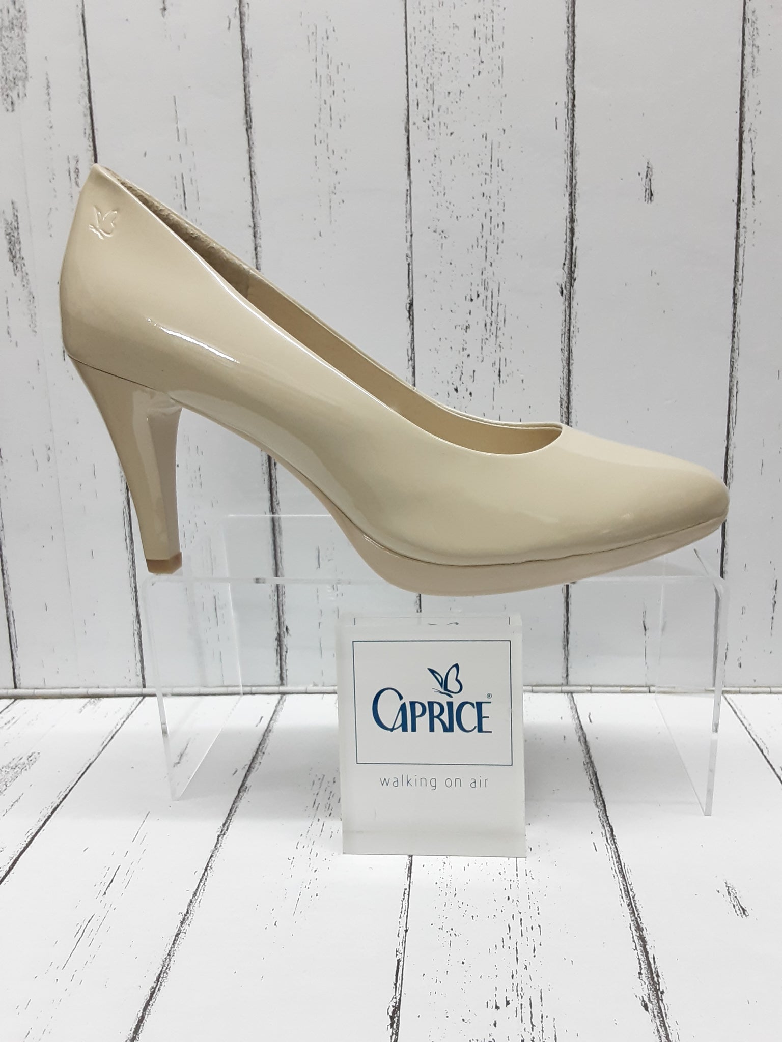 Ladies smart Cream patent leather court shoe with a 10mm platform and a 80mm heel.