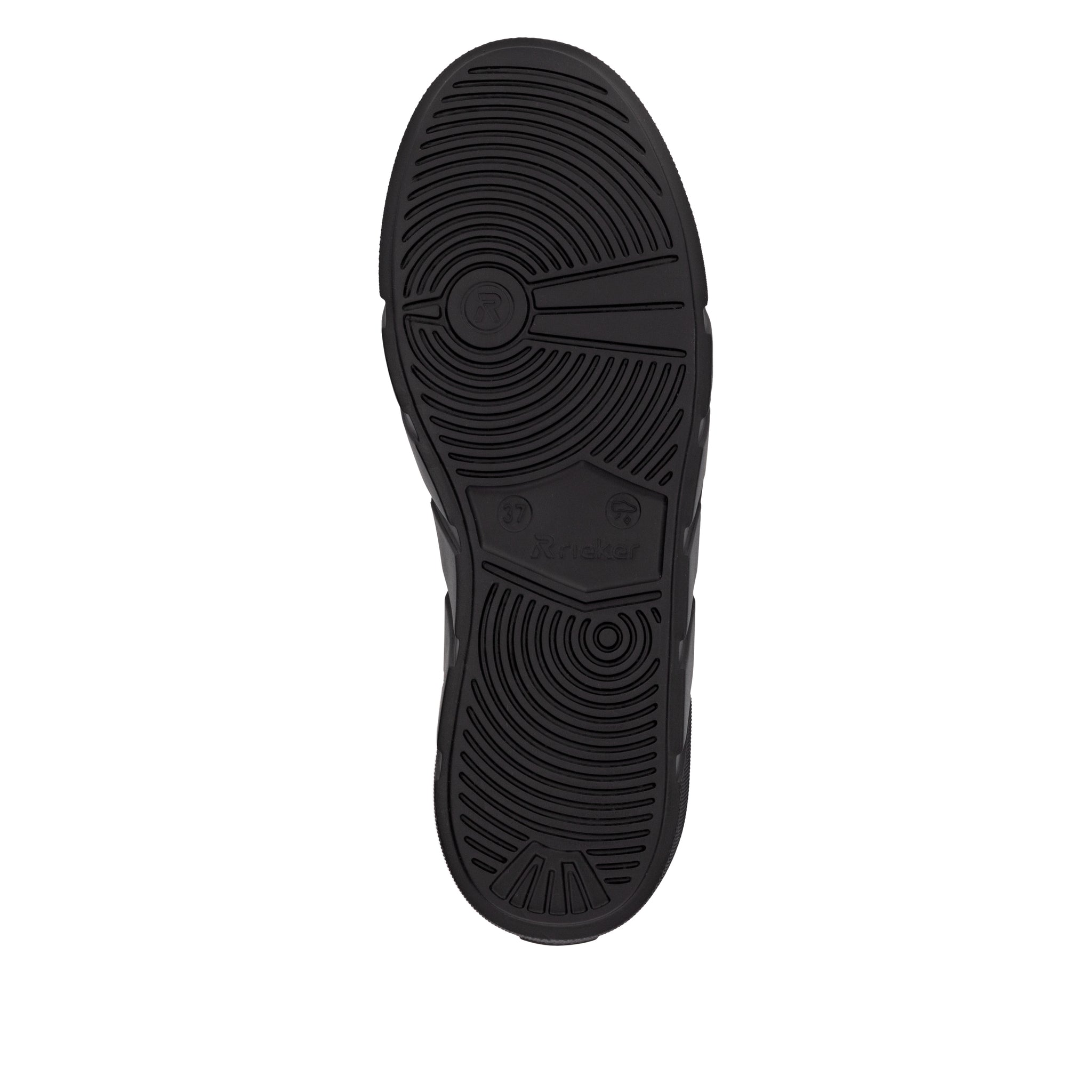 Ladies stylish low-top sneaker style lace up shoe by Rieker.   Super comfy and lightweight lace up in a soft patent finish set on a 50mm dark chunky wedge sole.  Padded, cushioned and with a removable insole.